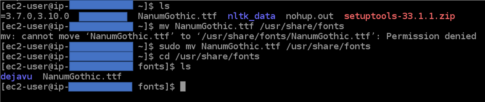 다운받은 폰트 파일을 fonts 폴더에 옮기기 위해서 명령어를 입력한다.